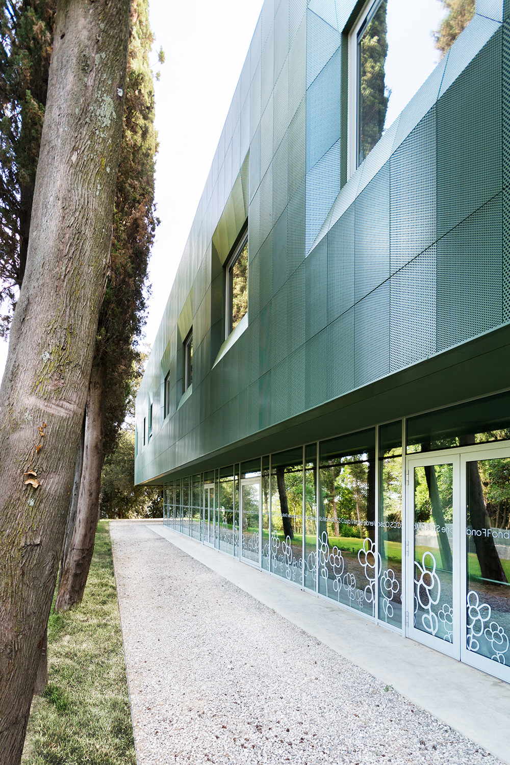 Il progetto attua un Piano di Recupero molto più ampio, al momento realizzato per la quasi totalità: manca di fatto il corpo dei laboratori seminterrati sul lato sud ovest dell´edificio, che verranno costruiti secondo il programma concordato a partire dal 2018. L´idea matrice dell´impianto è quella di salvaguardare nei materiali e nelle forme _ come evidenziato dalle geometrie delle coperture_ l´impianto originario e sottolineare l´ampliamento con forme e materiali maggiormente legati alla cultura contemporanea. In questo elaborato processo progettuale l´idea e la consapevolezza di intervenire in un luogo “fragile” da un punto di vista paesaggistico ci hanno aiutato: la scelta del colore verde, non uniforme, del secondo livello della facciata indaga sulla possibilità di inserire e attenuare il nuovo volume nel contesto. Ma la facciata ventilata non ha solo una valenza cromatica, ma vuol avere più attimi di lettura:il doppio livello microforato dei singoli pannelli le conferisce diafanità se osservata da vicino e massività se osservata da lontano. Infine ma non elemento marginale, il filtro e le bucatore sulla facciata principale esaltano il rapporto interno esterno: la luce naturale filtrata dal diaframma microforato crea nello spazio interno del vano scale principale una sensazione di quiescienza ; le bucature con cui dialoga la facciata creano due cannocchiali ottici che proiettano con lo sguardo il fruitore dello spazio interno sul percorso d´accesso storico alla vecchia villa in un caso e sulla vecchia colonica in fase di ristrutturazione nell´altro. Gli spazi indoor nella sua semplicità hanno voluto ricreare la sensazione e l´idea di un clima ovattato (in considerazione delle patologie neuropsichiatriche degli abitanti) il colore base utilizzato è un grigio chiaro molto avvolgente (RAL 7047) che dialoga con linee colorate che formano e sottolineano le tre diverse zone dove le ragazze sono divise in base al grado della loro patologia: il Verde, il Blu e l´Arancio dettaglio cromatico che ritroviamo in tutti gli arredi e le icone un po´ ancestrali che individuano le varie funzioni.