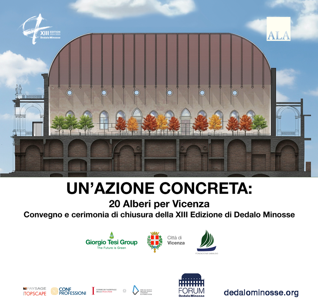 Paolo Posarelli, in qualità di Membro del Comitato Scientifico del Premio Dedalo Minosse, partecipa al convegno e alla cerimonia di chiusura della XIII edizione del Premio, dal titolo “Un’azione concreta: 20 alberi per Vicenza”. Nel corso dell’evento, Paolo Posarelli presenta il progetto di LDA.iMdA architetti, Naturart Village - Giorgio Tesi.